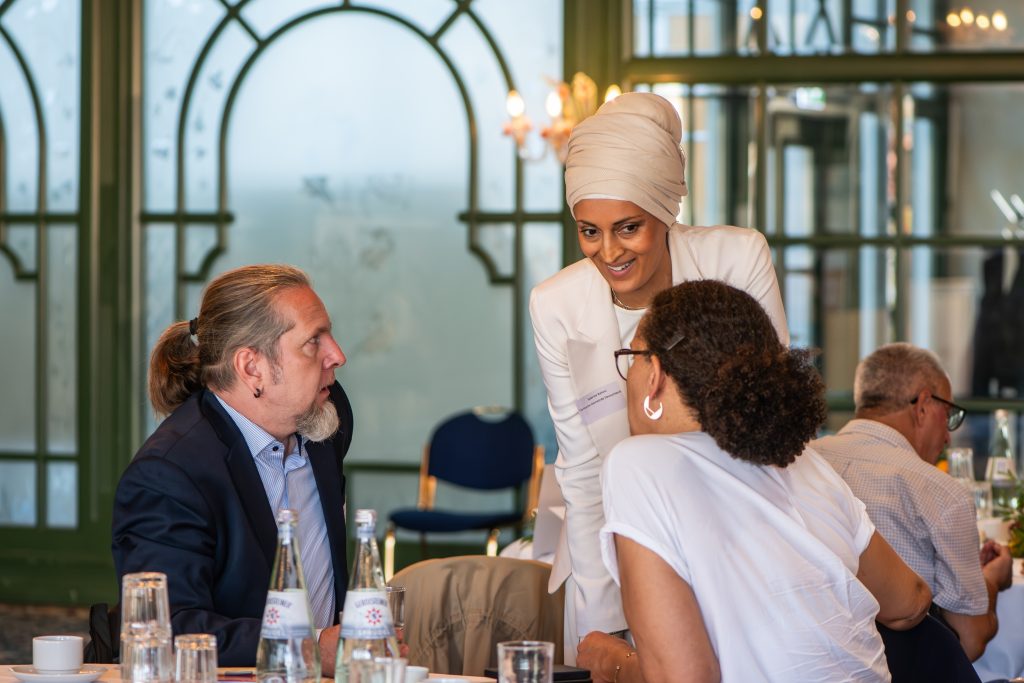 Beim Mittagessen stärkten angeregte Gespräche und Begegnungen das Netzwerk. Im Fishbowl-Gespräch am Nachmittag tauschten sich Vertreter*innen verschiedener Organisationen über Erfolge, Herausforderungen und nächste Schritte aus. Dabei standen als zentrale Themen im Fokus: die rechtliche Stärkung des AGG, der bedarfsgerechte Ausbau von Ressourcen für Beratungsstellen sowie ein intensiverer Austausch zum Strukturaufbau und zur Community-übergreifenden Intersektionalität. Außerdem wurde die Notwendigkeit betont, eine stärkere gemeinsame Stimme gegenüber der Politik zu entwickeln, Lobbyarbeit zu intensivieren und Positivbeispiele in den Medien sichtbarer zu machen. Nicht zuletzt wurde hervorgehoben, dass gesellschaftliches Wissen über Rassismus und Kolonialismus weiter gestärkt werden muss. Es wurde deutlich, dass die aktuellen Ressourcen für die Community-basierte Beratung gegen Rassismus nicht bedarfsdeckend sind und dass die CbB-Stellen schon jetzt über ihre eigenen Grenzen hinausgehen, um diese Mängel auszugleichen. Finanzielle Ressourcen, strukturelle Veränderungen, Bildung und Vernetzung sind notwendig, um die gesellschaftliche Teilhabe von Rassismus betroffenen Menschen nachhaltig zu stärken.